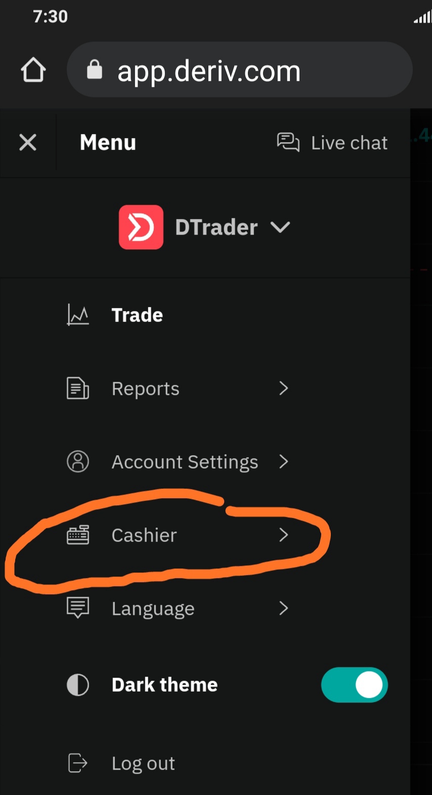 Para retirar, debe hacer clic en “cajero” en su página de derivados. Luego haga clic en “Retirar”. Verá la opción skrill allí. vea el lugar para encontrar “Cajero” en su página derivada de la imagen a continuación;